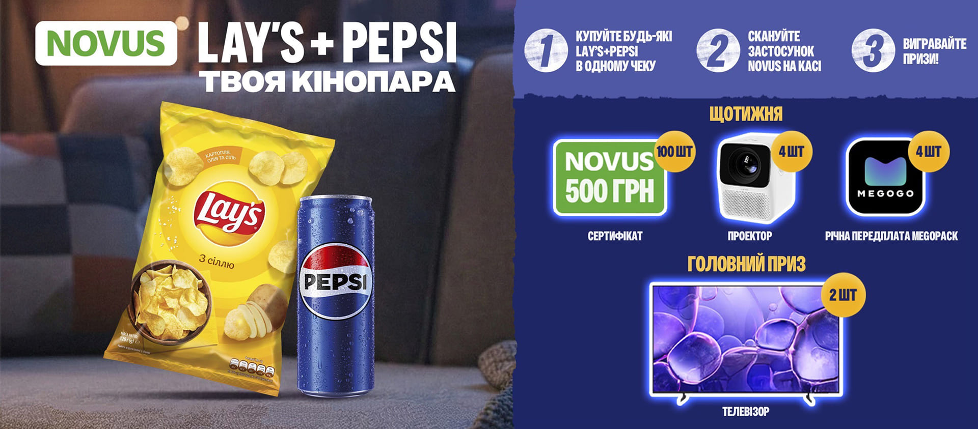 Акція триває з 05.02.2026 до 04.03.2026 на всій території України, крім тимчасово окупованих територій та зони проведення бойових дій. Купуйте Pepsi та Lay's в одному чеку — беріть участь у розіграші призів. Тільки для учасників програми лояльності «NOVUS». Кількість призів обмежена. Деталі в Офіційних правилах Акції.